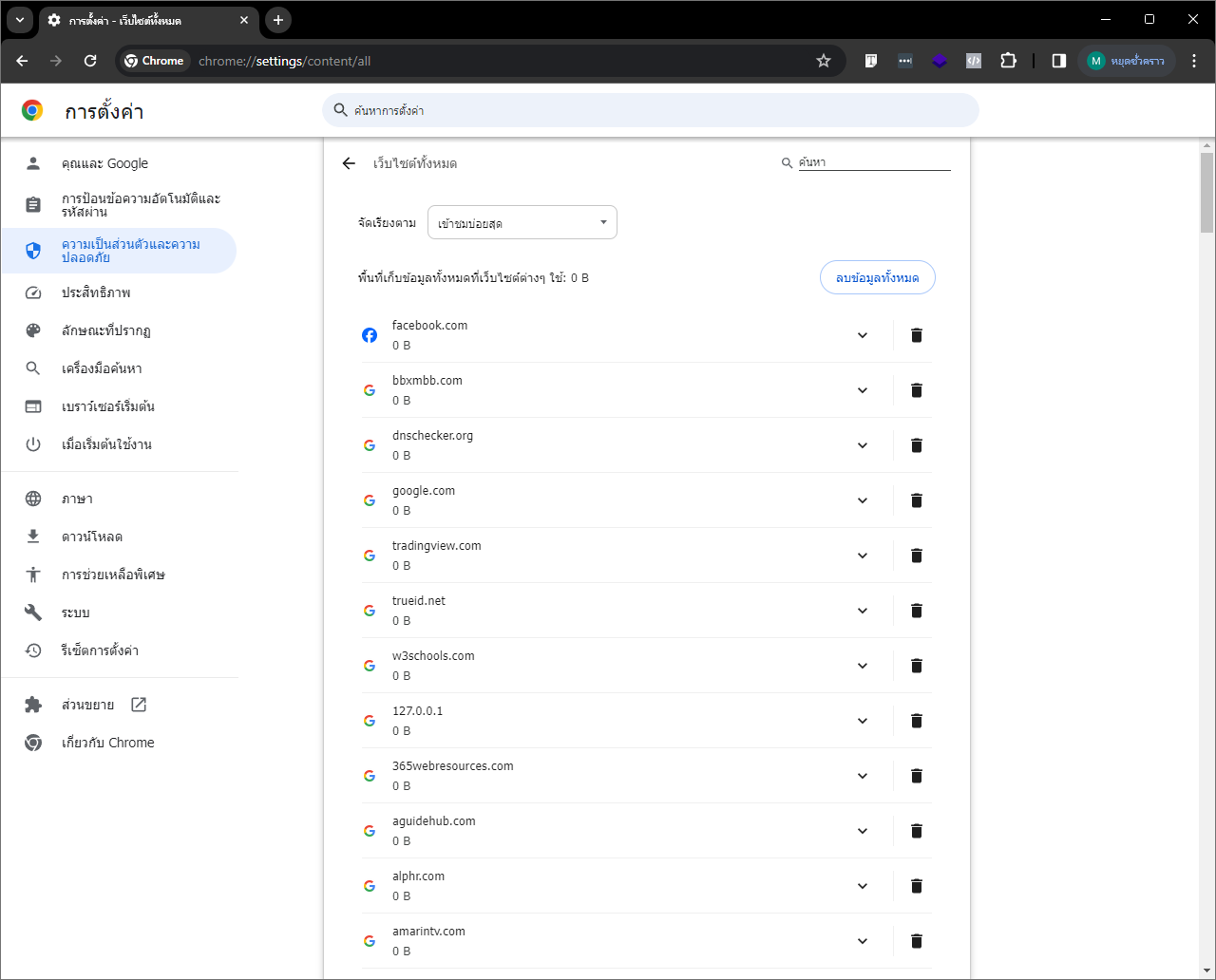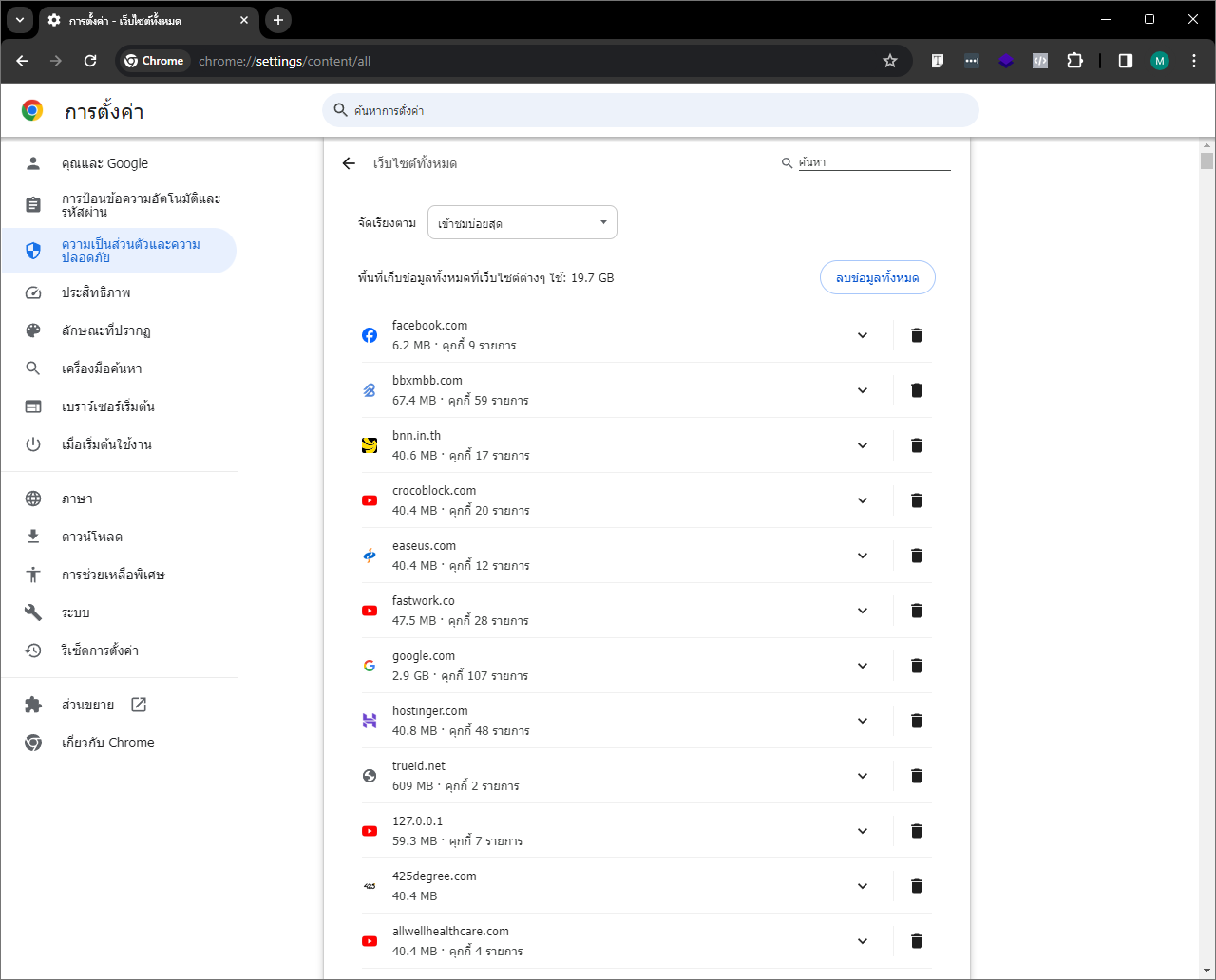สำหรับใครที่ใช้ Chrome แนะนำให้ไป clear cache ที่ไม่ได้ใช้งานออกใน “Settings” -> “Privacy and Security” -> “Cookies and other site data” -> “See all cookies and site data” และหาไฟล์ที่ไม่ได้ใช้ออก