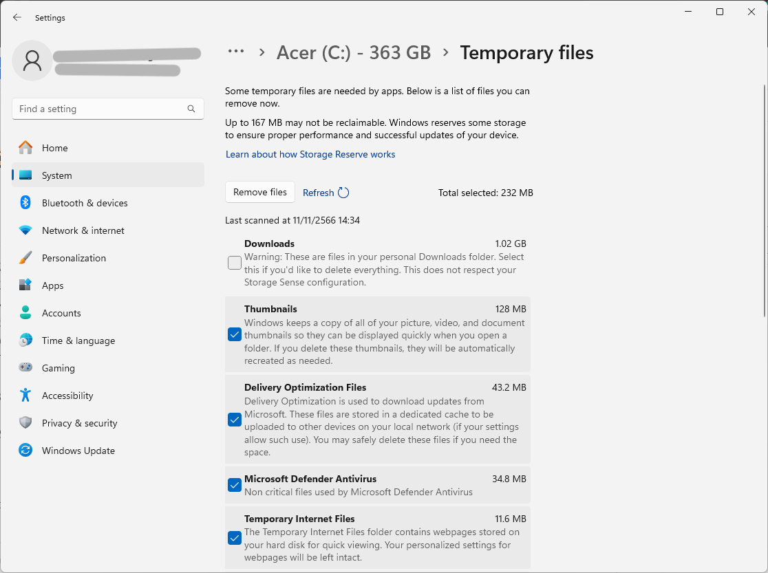 - คลิก Remove Files (โดยที่ยังไม่ได้ เลือก Downloads เผื่อมีบางไฟล์ที่เรายังต้องการอยู่)