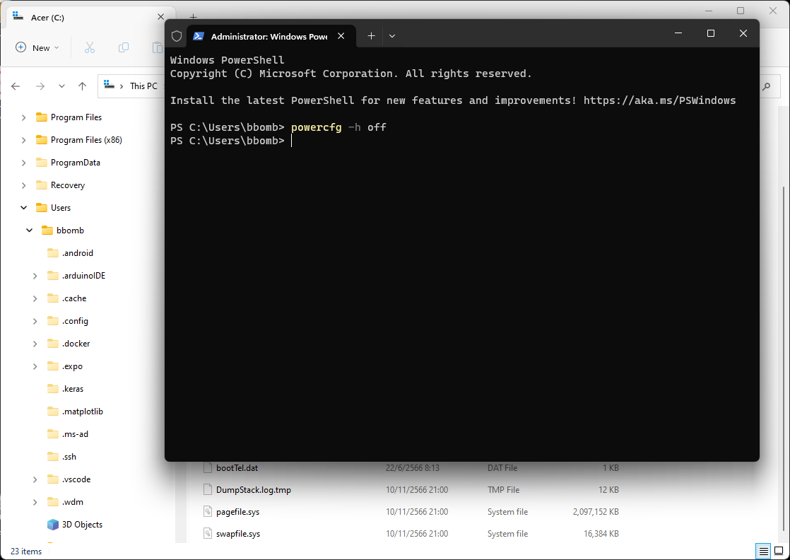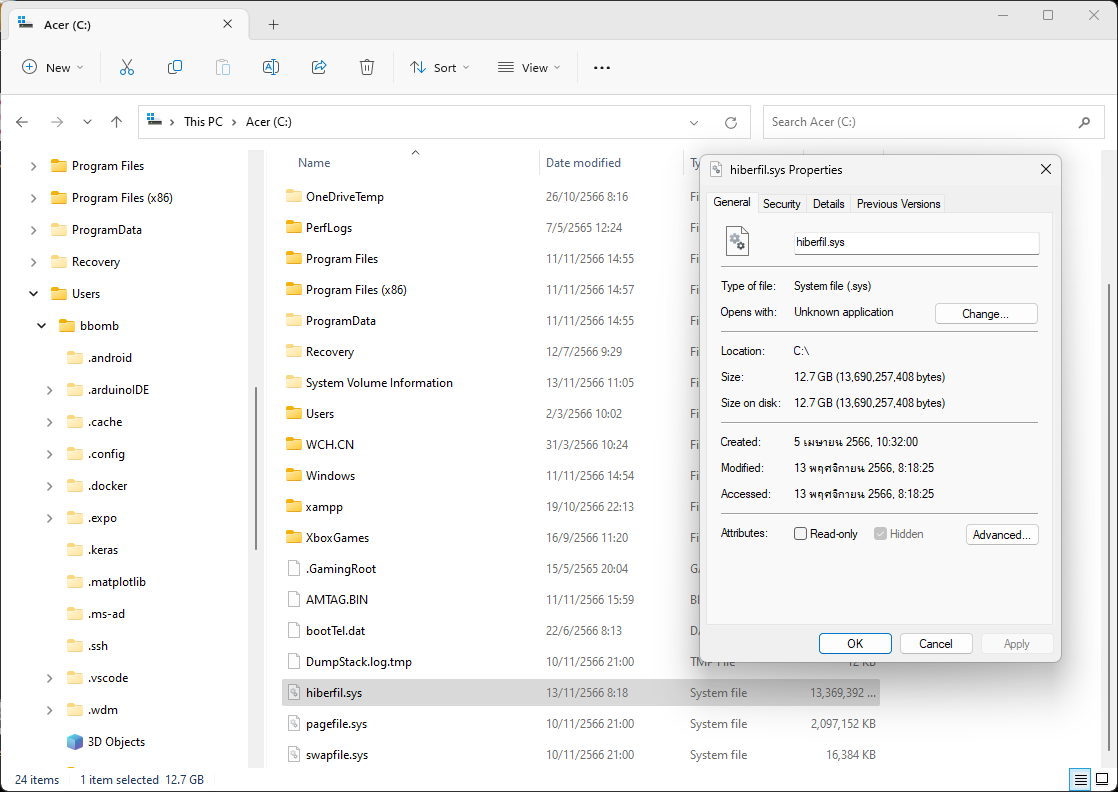 สำหรับใครที่ไม่ได้ใช้งาน Hibernation ก็สามารถลบได้ตามรูปภาพข้างล่างเลย ไม่ส่งผลต่อการ Sleep ซึ่งส่วนตัวผมไม่ได้ใช้งานเลยลบออกดีกว่า ประหยัดไปได้ถึง 12.7 GB เลยทีเดียว