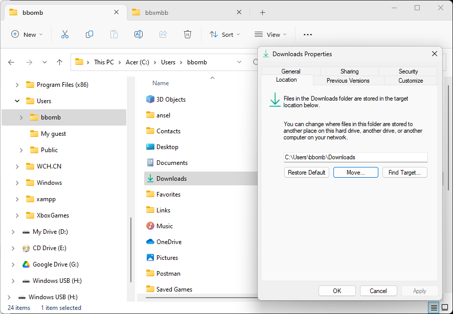 ทำการเปลี่ยน Folder location path ไปอยู่ Drive D แทน ในรูปภาพจะโชว์การย้ายเพียง Downloads Folder เท่านั้น
