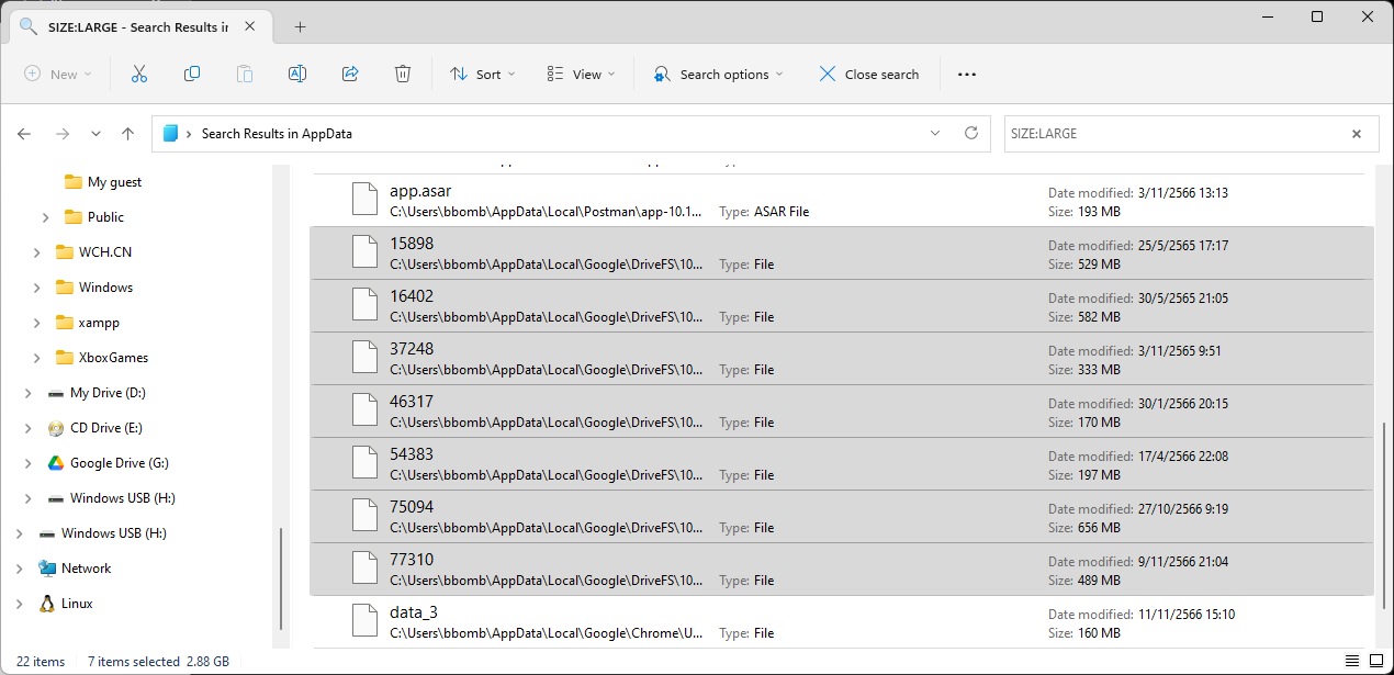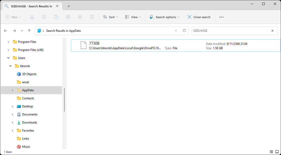 ในกรณีเครื่องของผม ไฟล์ที่มีขนาดมากกว่า 4GB นั้น ไม่มี แต่ไฟล์ที่อยู่ระหว่าง 1 GB และ 4GB มี 1 ไฟล์ ซึ่งพอลองเอาข้อมูลไปเซิจก็พบว่าเป็นไฟล์จาก Google Drive เป็น Stream File เฉยๆ ซึ่งผมลองลบดูก็ไม่ได้มีปัญหาอะไร ประหยัดเนื้อที่ไปได้มากถึง 1.5 GB เลยทีเดียว