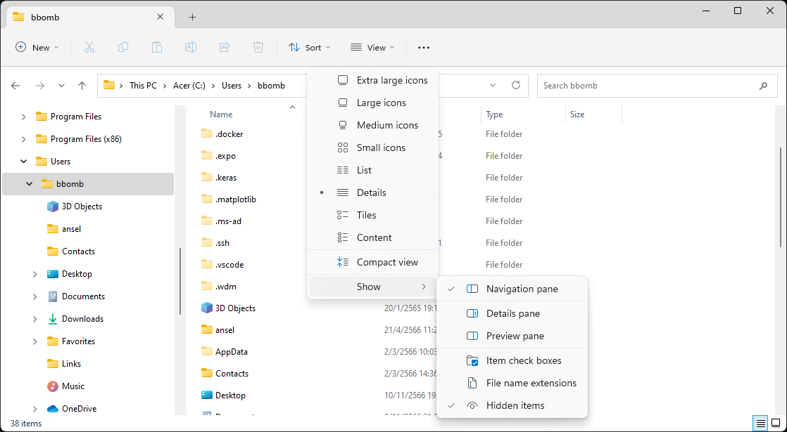 โดยก่อนที่จะเข้าไปใน AppData ได้เราต้องเปิดการมองเห็นของไฟล์ที่ถูกซ่อนไว้ก่อนตามรูปที่ 1 โดย