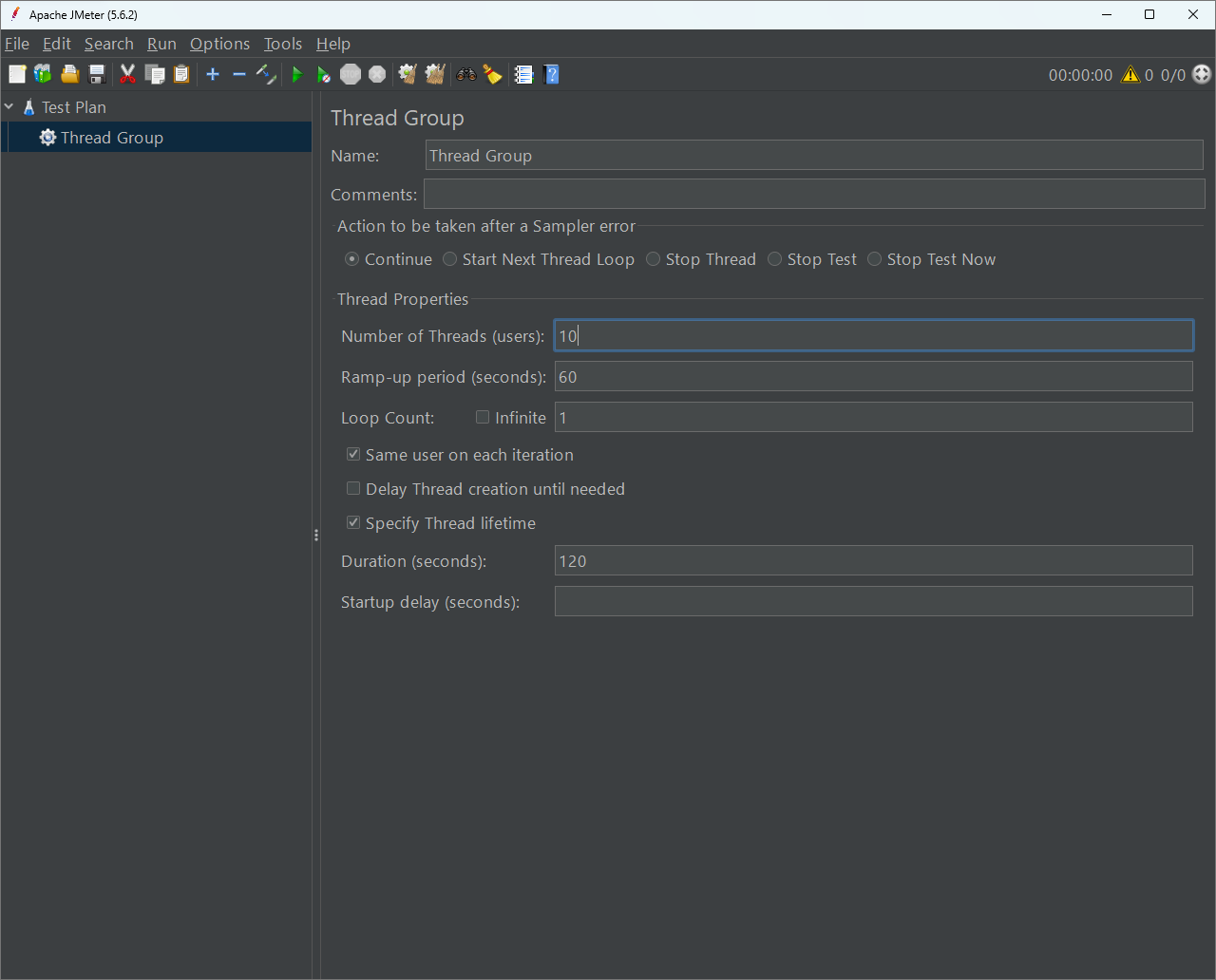 จากการตั้งค่าข้างต้นหมายถึง มี users ใช้งาน 10 คน โดยค่อยๆเพิ่มขึ้นจึงครบ 60 วินาที จากนั้นใช้งานไปจนถึง 120 วินาที โดยให้รันไปเรื่อยๆจนครบ