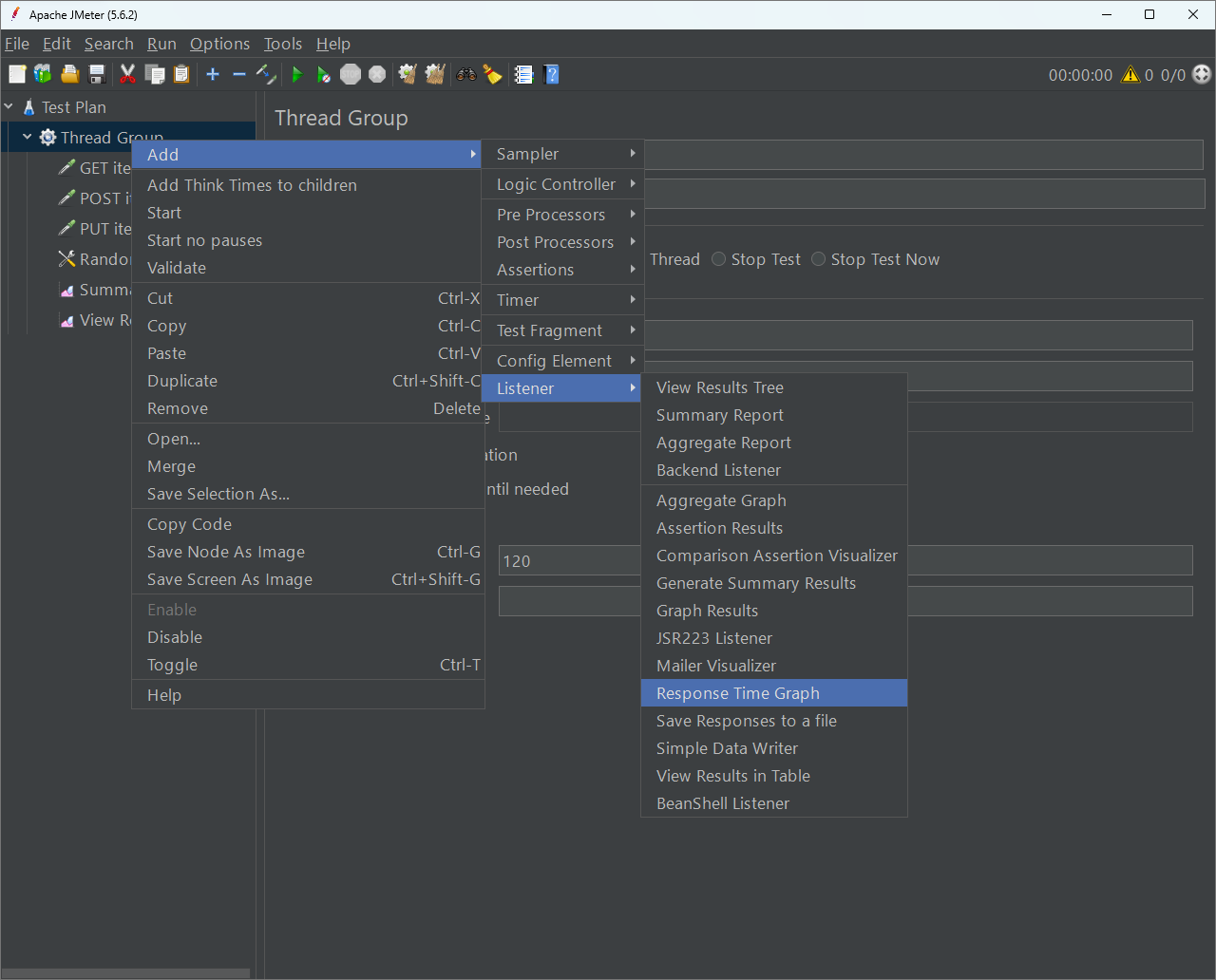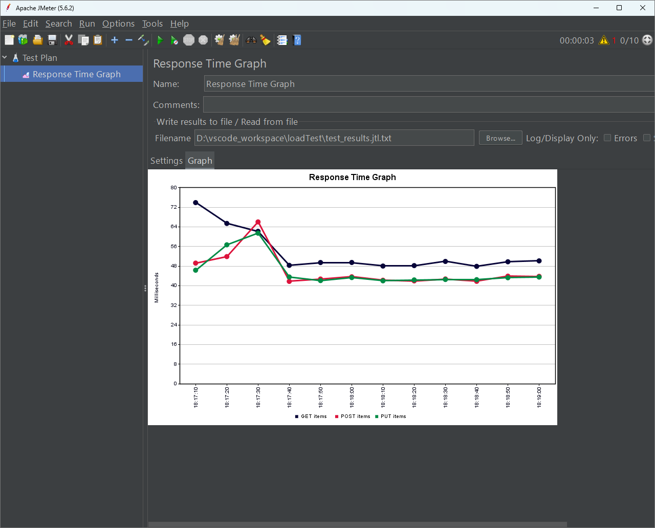 จากนั้นเราสามารถไปเปิดไฟล์ test_results.jtl ผ่าน JMeter ผ่าน Listener ที่เราต้องการได้อีกที เช่นต้องการมาดู Response Time Graph ทีหลังดังรูปเป็นต้น