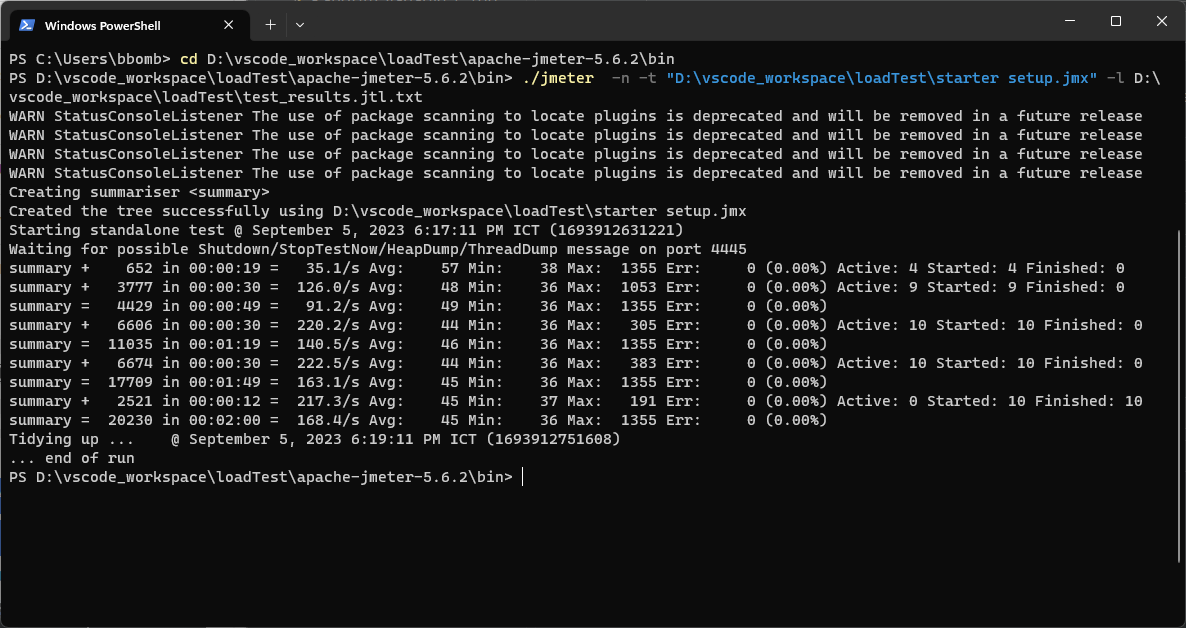 สำกรับการทดสอบที่มี number of Threads มากๆ แนะนำให้รัน ผ่าน Command line เพราะถ้าหากรันผ่าน GUI ตัว Jmeter จะเก็บค่าไม่ทัน โดยต้อง cd เข้าไปที่ ..\apache-jmeter-5.6.2\bin ก่อนแล้วถึงรันโค้ดดังนี้