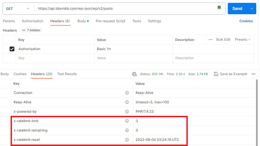 ลอง GET Method ดู ก็จะสังเกตเห็น response header ขึ้นโชว์ว่าถูกจำกัดกี่ครั้ง ในตัวอย่างนี้ผมได้ตั้งค่า maximum request อยู่ที่ 3 ครั้งต่อ 10 วินาที หมายถึงทุก 10 วินาที การ request count จะถูก reset และสามารถ request ค่าใหม่มาได้ เพื่อให้งานต่อการแสดงตัวอย่าง ซึ่งผู้อ่านสามารถไปปรับเปลี่ยนได้ที่ custom_rate_limiting($max_requests,$per_second) ได้เลย โดย $max_requests คือจำนวนการ request สูงสุดภายในช่วงเวลา $per_second ฟังก์ชั่นนี้มีค่าพื้นฐานอยู่ที่ 100 ครั้งต่อ 60 นาที
