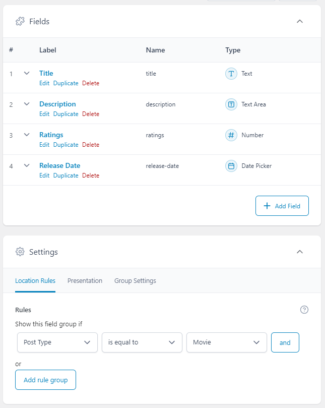 - คลิ๊ก Add New ใน Field Groups และตั้งค่าตามรูปที่ 4 เลือกให้ Field Group นี้ไปเชื่อมกับ Movie Post Type