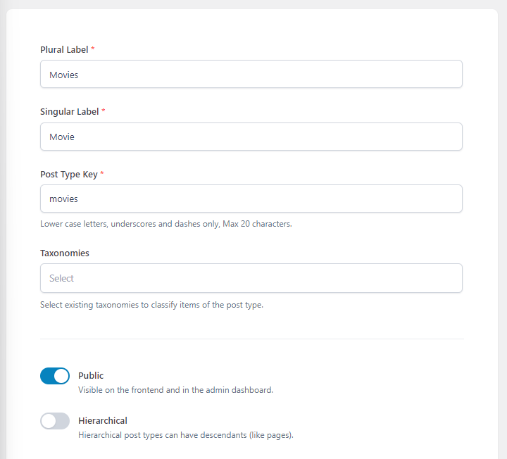 หลังจาก Activate Plugin แล้วในแทบ sidebar ก็จะเห็น ACF เมนู สามารถคลิ๊กเข้าไปเพิ่ม สร้าง Post Type ใหม่ก่อนในที่นี้จะจำลองให้เป็น Movies สามารถตั้งตามตัวอย่างนี้ได้เลย